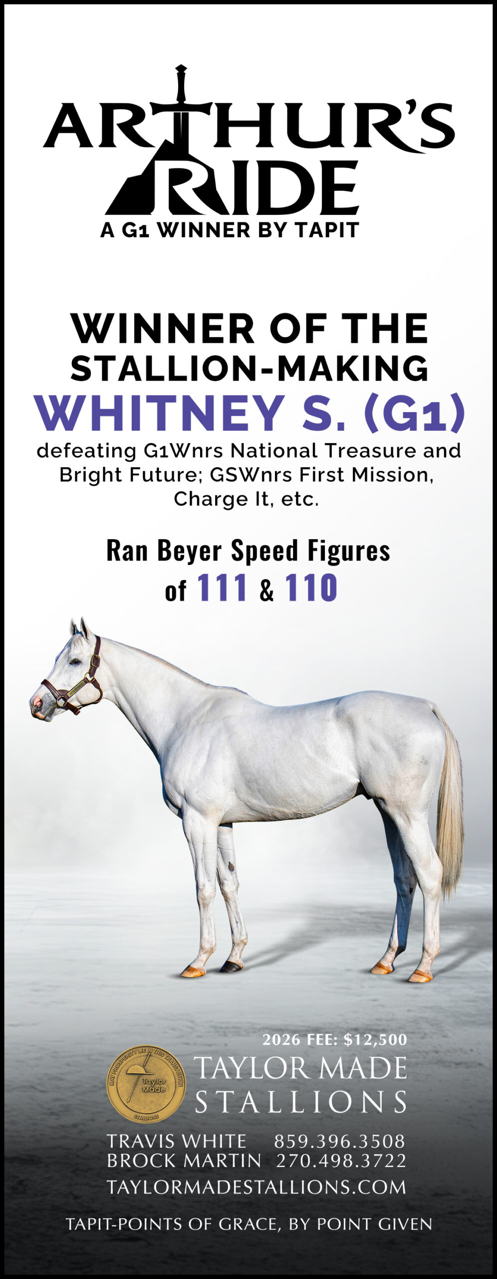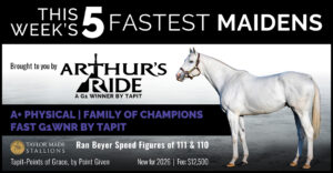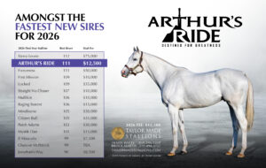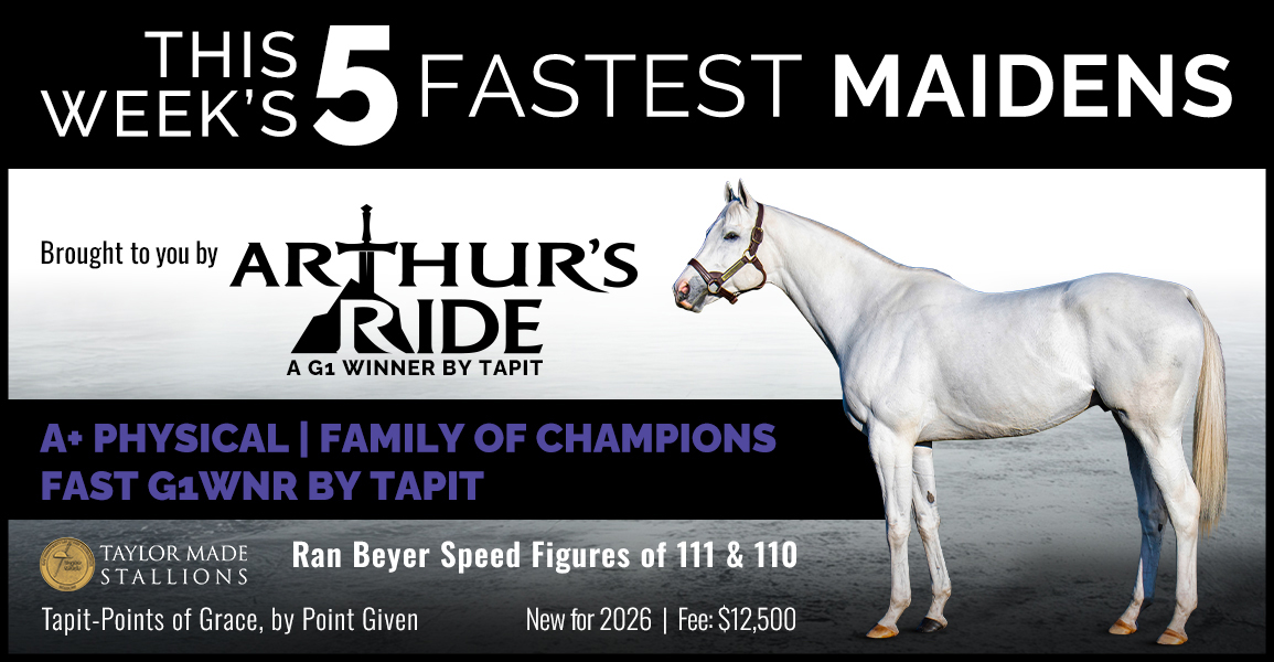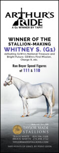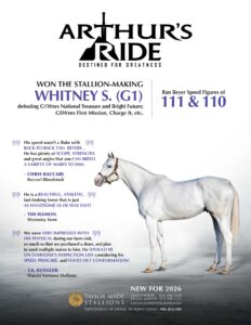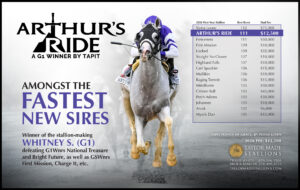 A grade one winner with a top Beyer of 111, Arthur’s Ride defeated a field that included Champion Older Horse National Treasure to take the Whitney Stakes (G1). A son of Tapit, he is half-brother to a Champion and out of a Champion.