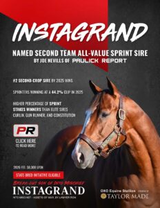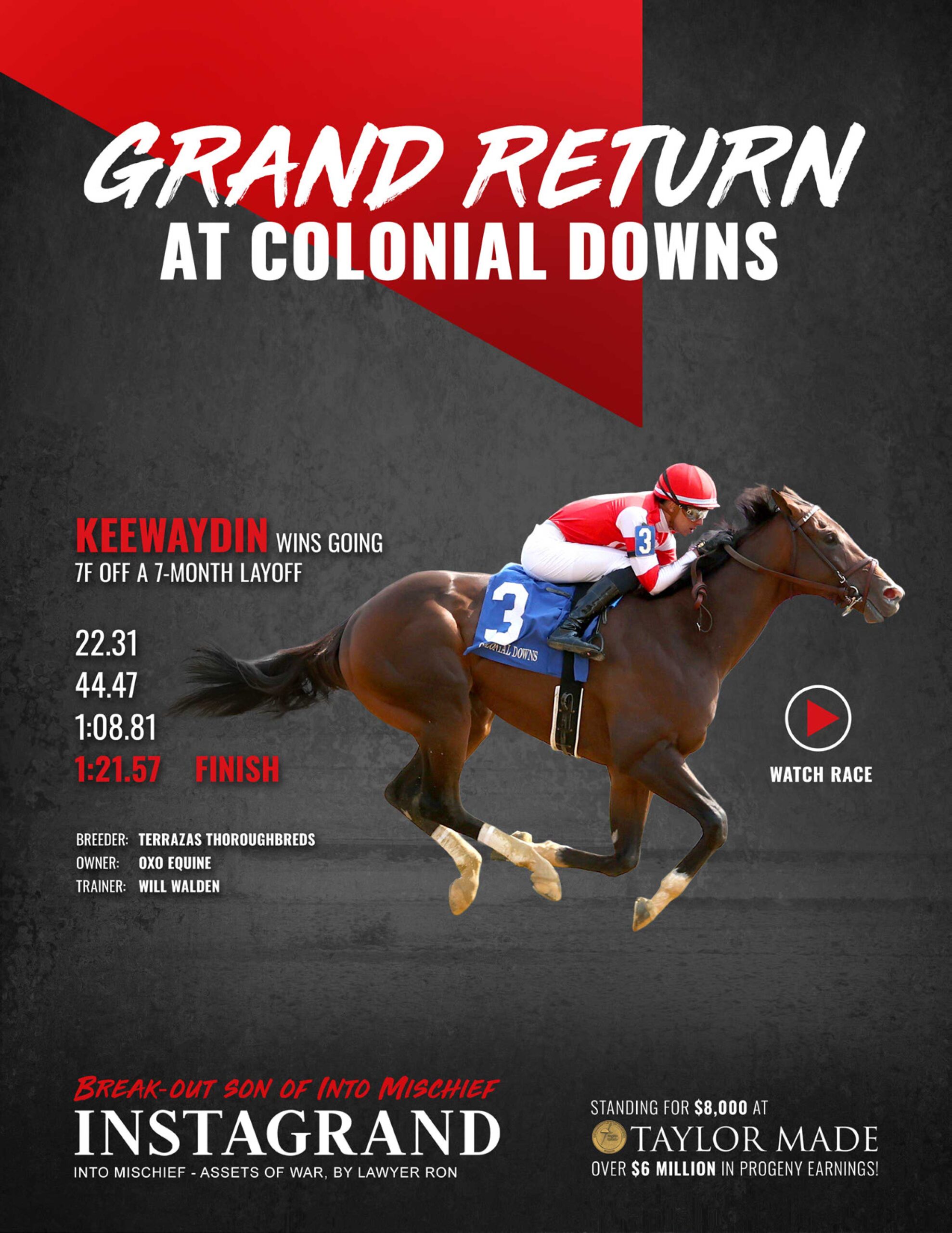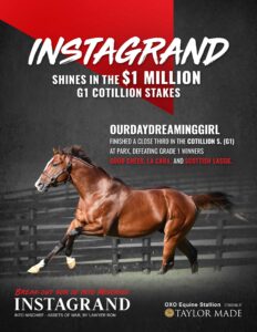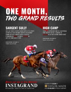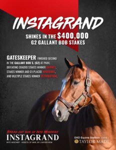 A $1,2,000,000 two-year-old in training purchase, Instagrand was a debut winner by 10 lengths going five furlongs in 56:00, and followed up with 10¼ lengths victory in the Best Pal Stakes (G2), demonstrating himself to be one of the most spectacular juvenile colts to represent the sensational Leading Sire, and twice Leading Sire of Two-Year-Olds, Into Mischief.