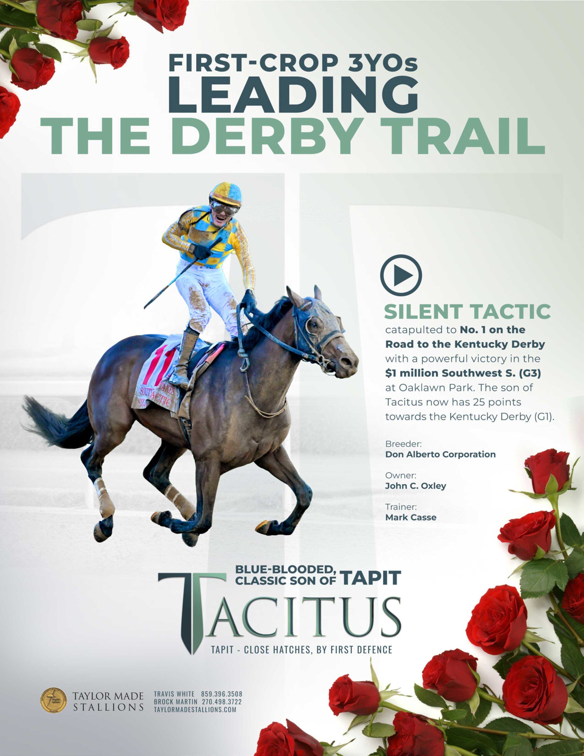 A three-time grade two winner, Tacitus also earned places in seven other graded stakes, including the Kentucky Derby (G1), Belmont Stakes (G1), Travers Stakes (G1), Woodward Handicap (G1), and two renewals of the Jockey Club Gold Cup (G1). By Tapit, record-breaking three-time Leading Sire and now a sire of sires, out of Champion Close Hatches, he from the fabulous Best in Show family that has produced no less than 29 stallions who have sired grade one winners.